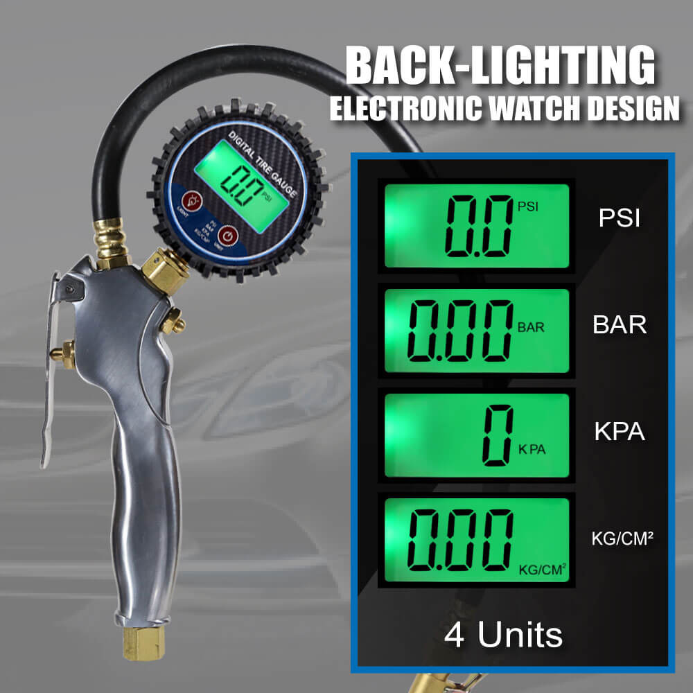 Introducing the Aluminum Digital Tire Inflator with Backlight Pressure Gauge - your reliable and easy-to-use solution for accurate tire pressure measurement and inflation.