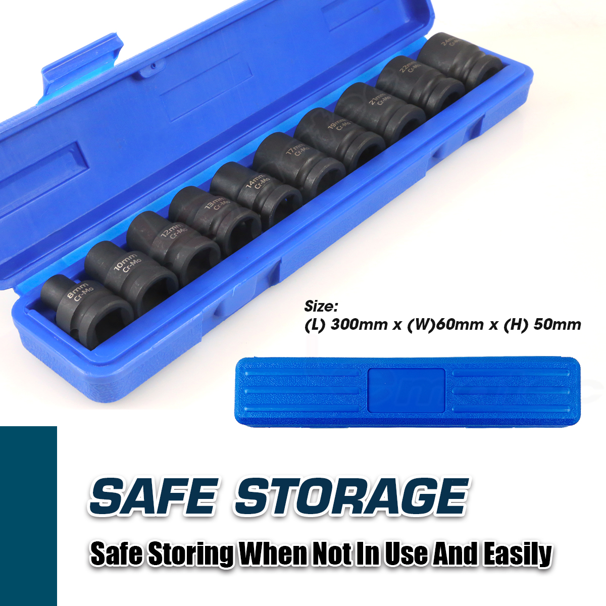 Safe Storage: Prioritize safety and organization with our intelligently designed storage solution. Each socket finds its secure place within a compact 300 mm x 60 mm x 50 mm case, ensuring easy accessibility and protection when not in use.
