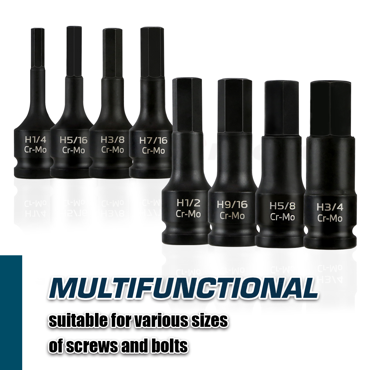 Cr-Mo Material: Crafted from CR-MO (Chromium-Molybdenum) alloy, these sockets are not just durable but built to withstand various tasks, providing long-lasting strength.