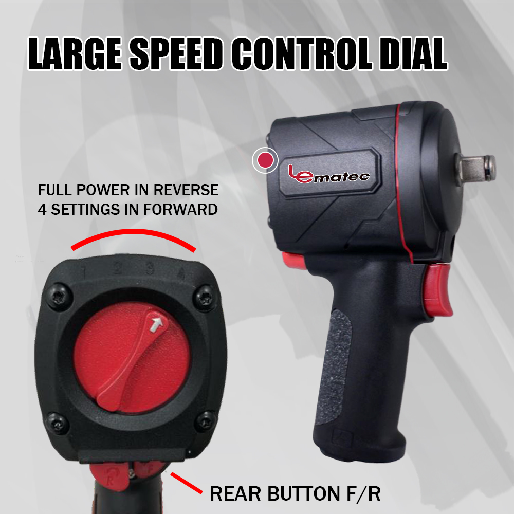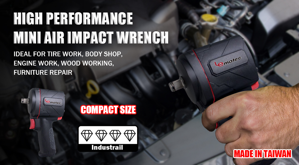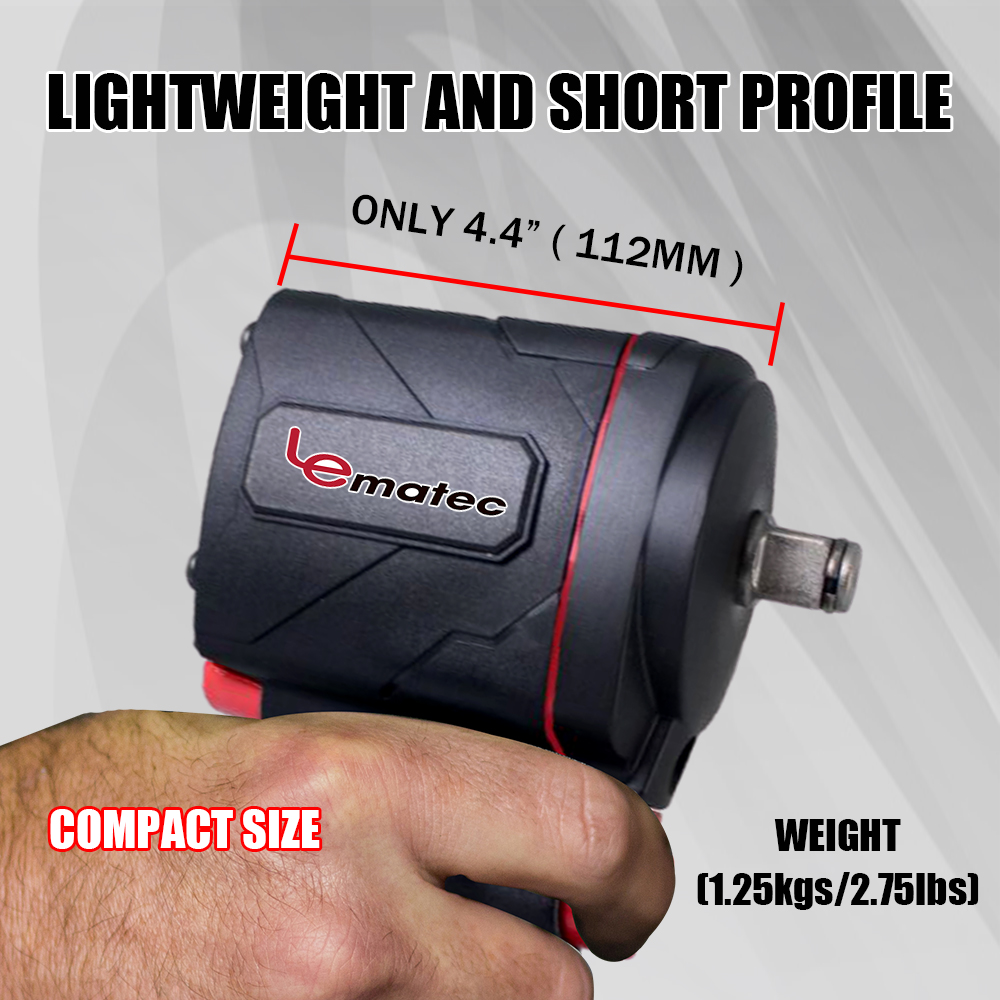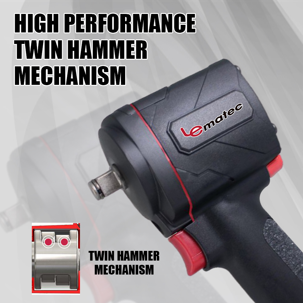 The LEMATEC 1/2" Twin Hammer Mechanism Impact Wrench is a professional-grade tool with a durable design ideal for use in the tire, body shop, engine, woodworking, and furniture repair. It features a lightweight and short profile with a textured grip that increases retention when hands are greasy and oily.