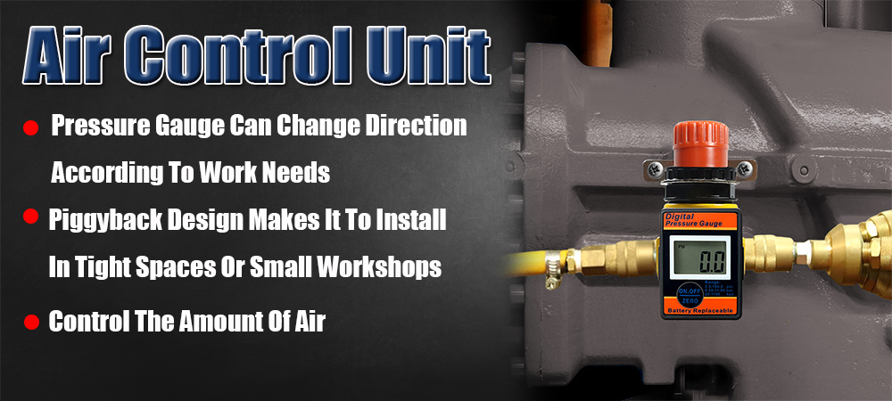 The AS-203D features a digital LCD gauge, providing accurate and easy-to-read pressure measurements. This advanced gauge allows for precise adjustments and air pressure monitoring, enhancing efficiency and productivity.