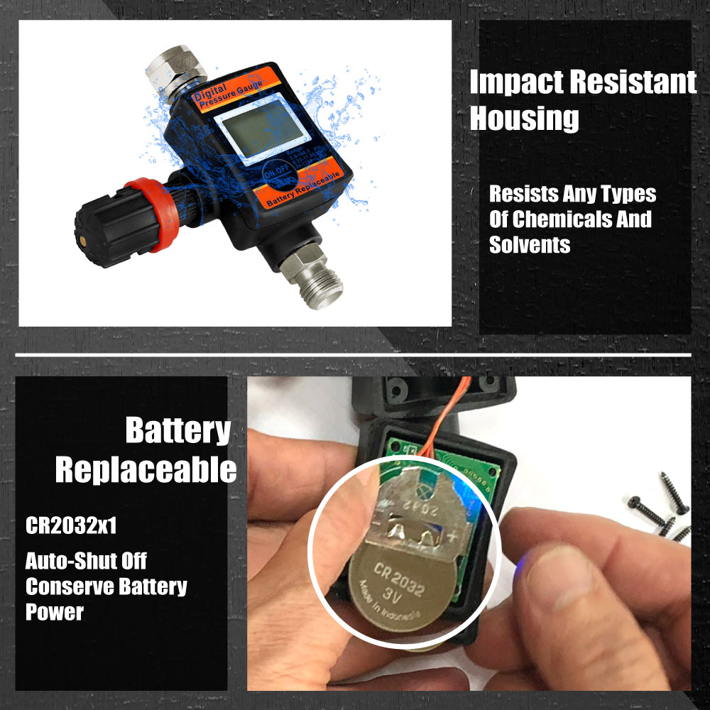 BACK-LIGHT AND AUTO SHUT-OFF DISPLAY: The DAR06E-1 Digital Air Compressor Regulator comes with a smart design which includes a digital LCD display with back-lit function for easy to read pressure settings. It is powered by a replaceable CR2032 battery and has an auto shut-off mechanism to conserve battery life.