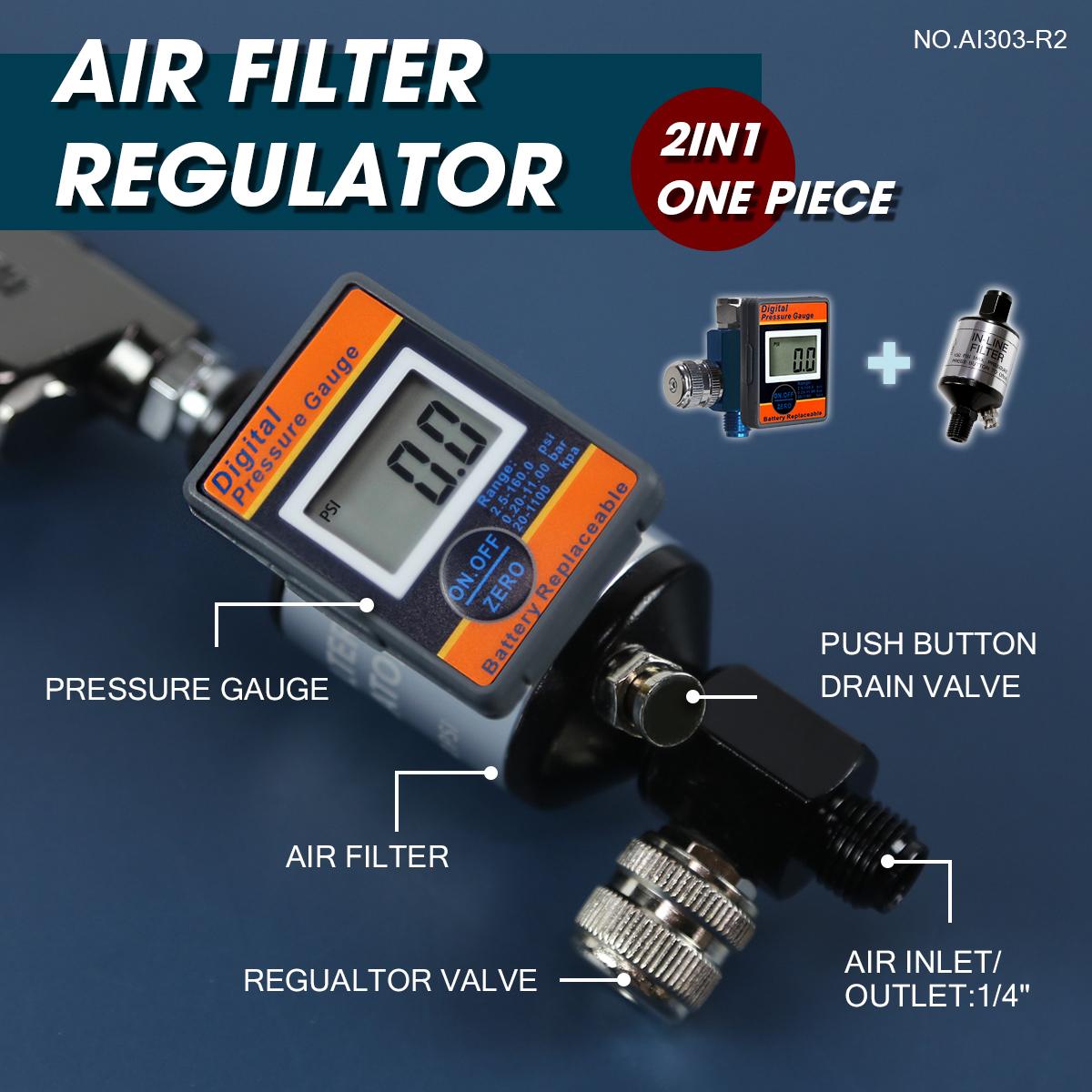 AI303-R2, your all-in-one solution featuring an air filter, regulator, and digital pressure gauge, all in a compact 1/4 inch size.