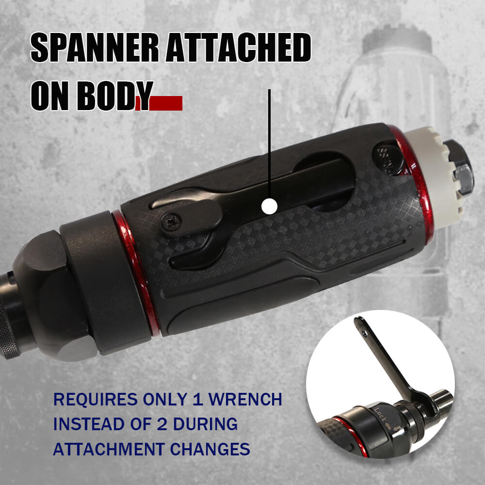 The straight 400W die grinder delivers high torque and efficient performance for rough edges and mounting points. In the new design, only one wrench (usually two) is needed to replace accessories, which is more convenient.