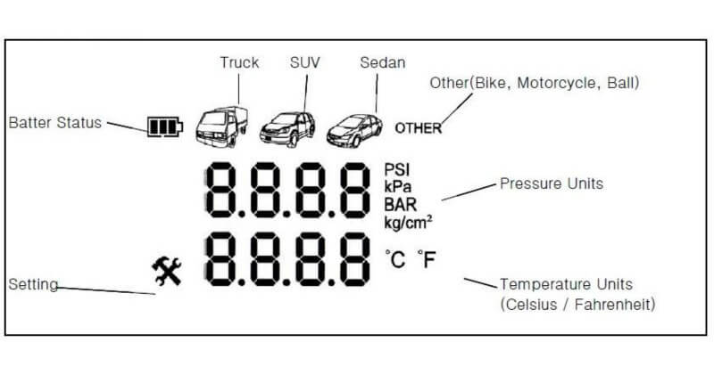 - 2.3.1 If you choose the default pressure of Truck to inflate, the Buzzer will "bee" 2 seconds for 3 times and show the current pressure after finish inflating.