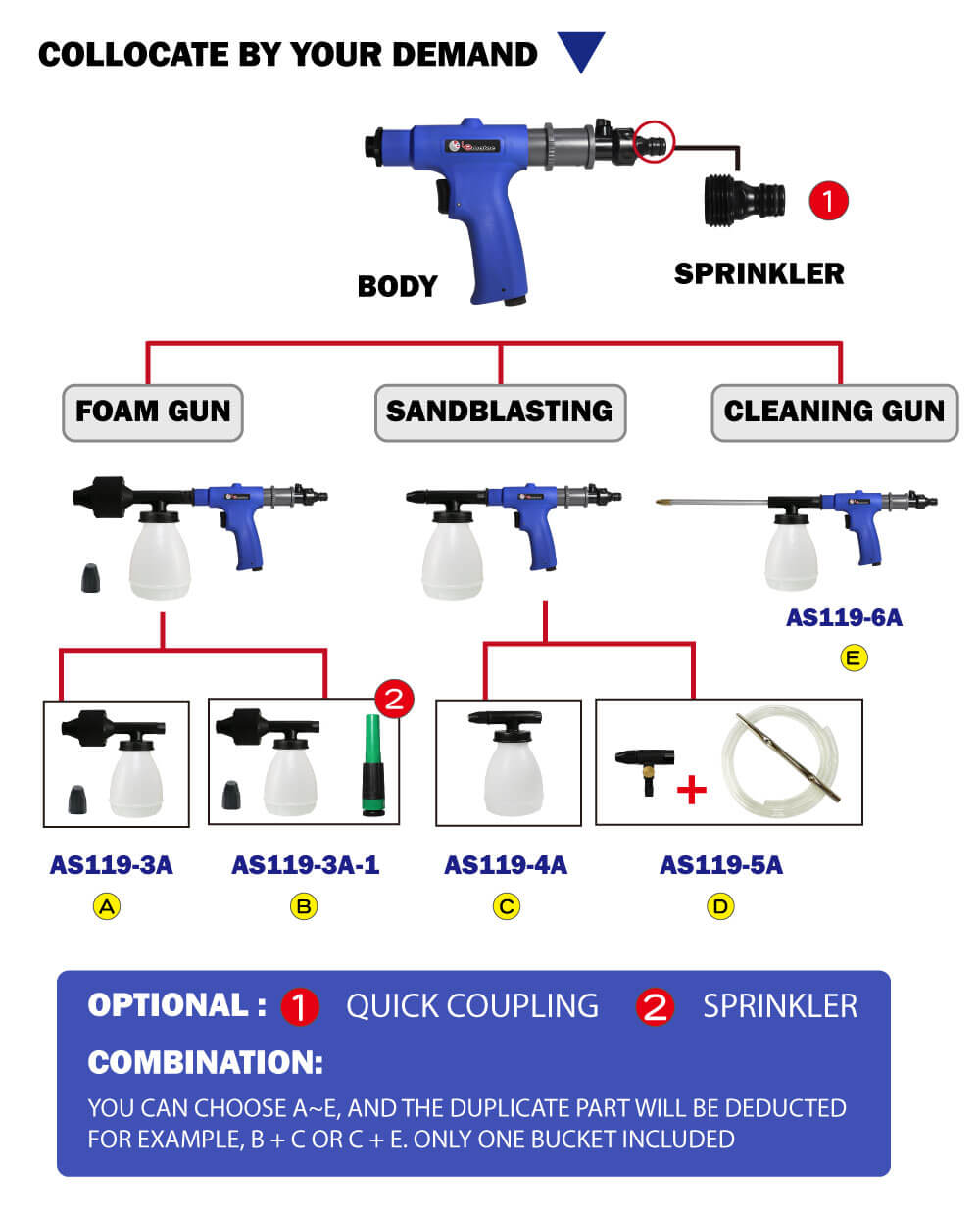Air foam gun kits, one gun for foam, water/engine cleaning, sandblasting and blow/dust gun function.