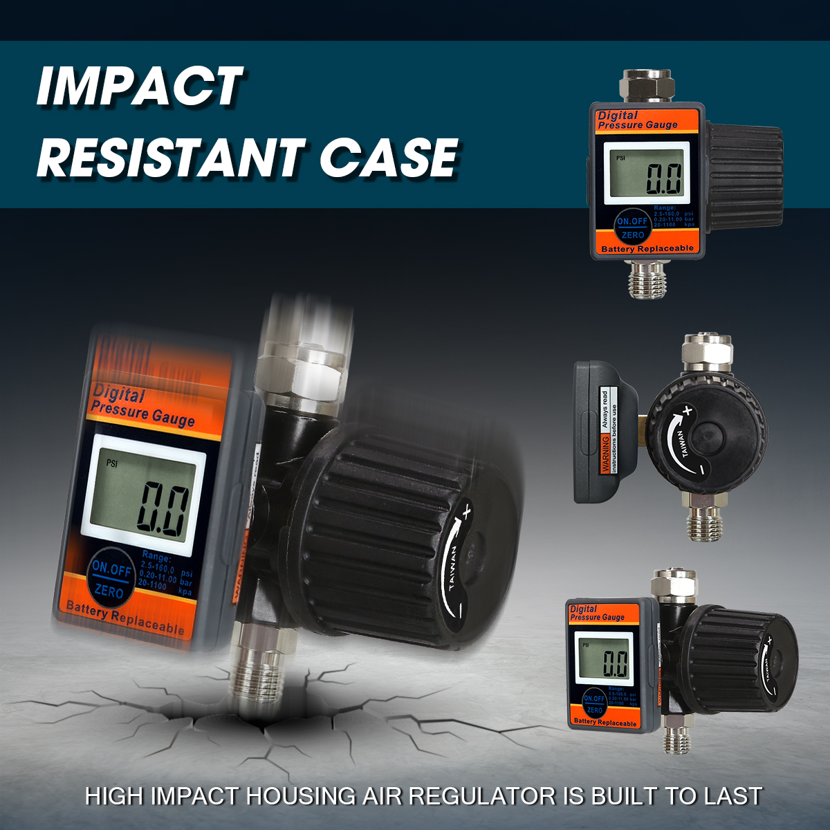 *The Lematec DAR02B Digital Air Pressure Regulator Gauge is an accurate and durable tool accessory for measuring air pressure in various applications. It supports three pressure units (PSI, BAR, and kPa), has an auto-shutoff function, and is impact-resistant. The 1/4" inlet and outlet make it compatible with most air tools, and the solvent-resistant housing ensures it can withstand harsh conditions like spray painting.