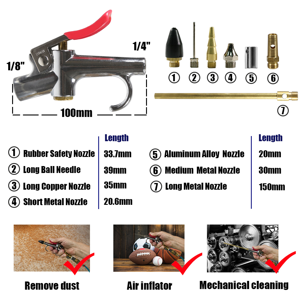 Air inlet: 1/4" With: Rubber satety nozzle, long ball nozzle, copper nozzle, shory metal nozzle, aluminum alloy nozzle.