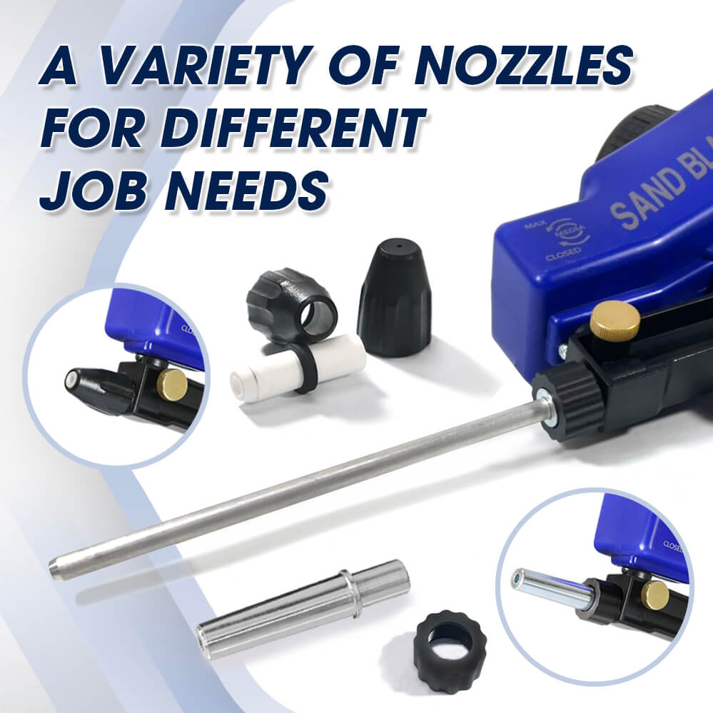 -The long nozzle on an air sandblaster gun allows the user to direct the abrasive material more precisely and reach into tight spaces that a larger sandblaster might not be able to access. This makes it ideal for removing rust and paint from small metal surfaces, cleaning automotive parts, and etching designs onto glass or metal.