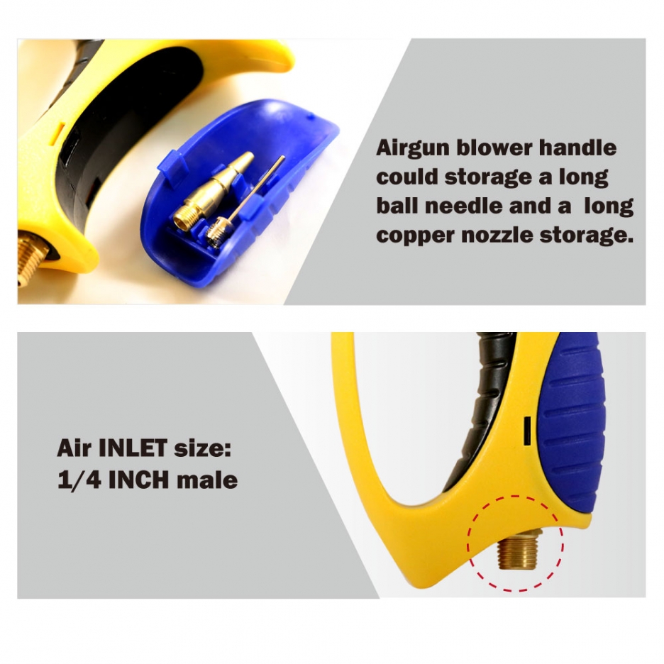 Tire inflator gun with pressure and ball needle and long copper nozzle.
