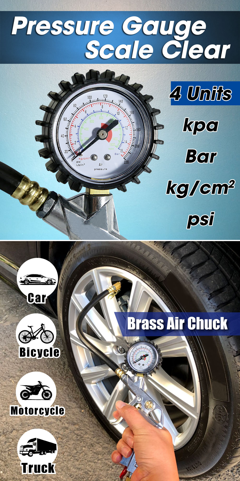 Measures pressure range:0-220 PSI . 0-15 Bar . 0-1500 Kpa