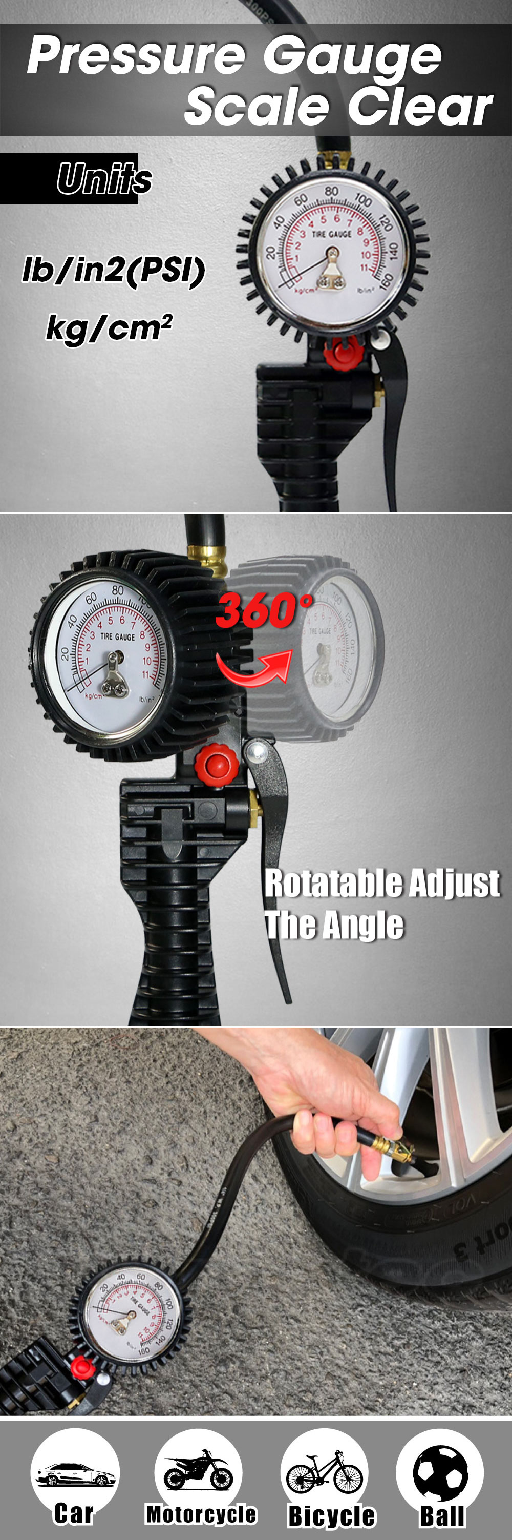 Measures pressure range:0~160 lb/in2(PSI) ,0~11 kg/cm2